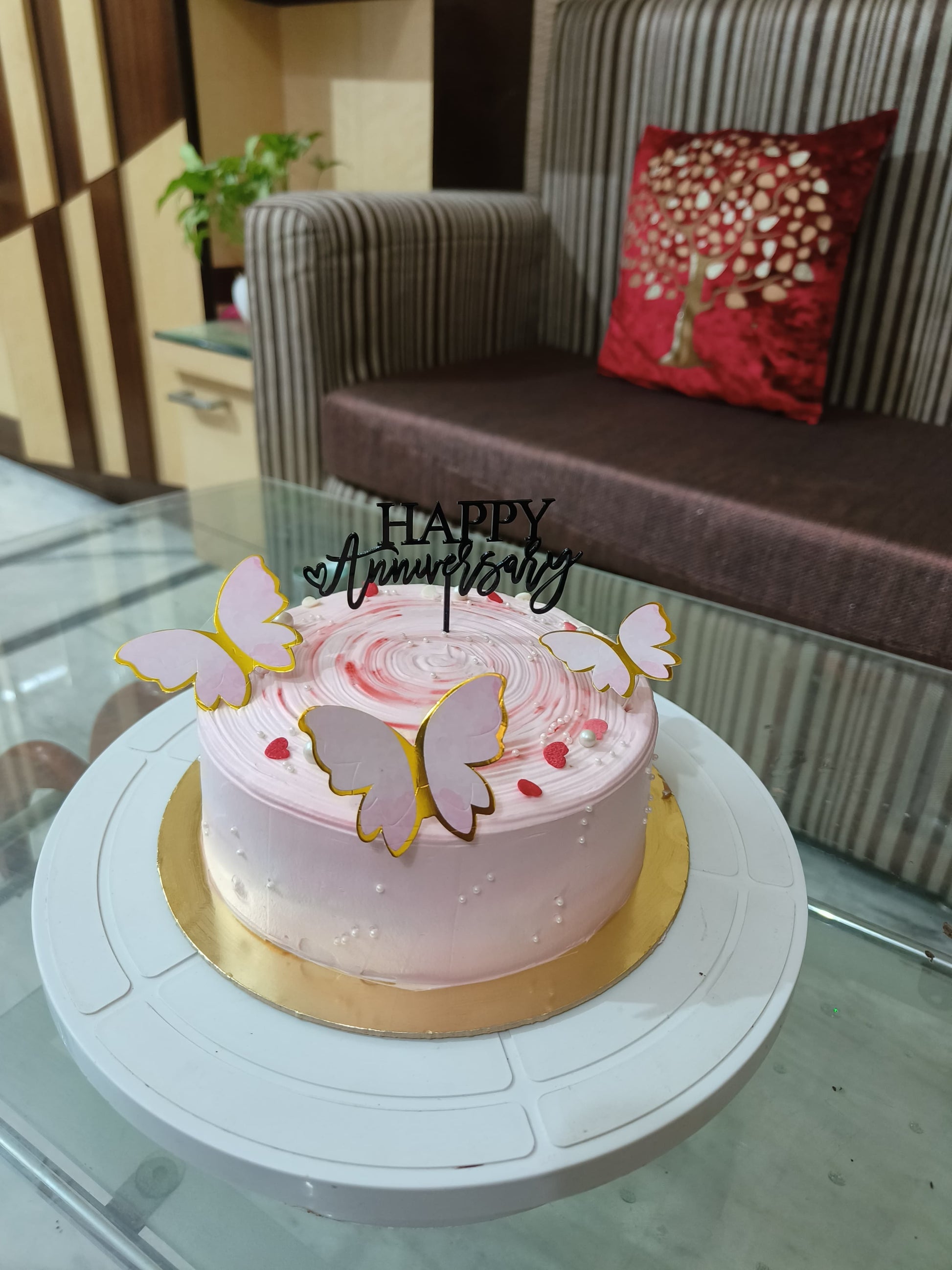 Celebrate your love with this dreamy pink ombré vanilla cake, designed to flutter hearts. Decorated with elegant edible butterflies outlined in gold, delicate sugar pearls, and tiny hearts, this cake captures the magic of a lasting bond. The soft swirl of pink frosting adds a romantic touch, while the “Happy Anniversary” topper makes it the perfect centerpiece for your special day. Light, lovely, and full of joy — just like your journey together.